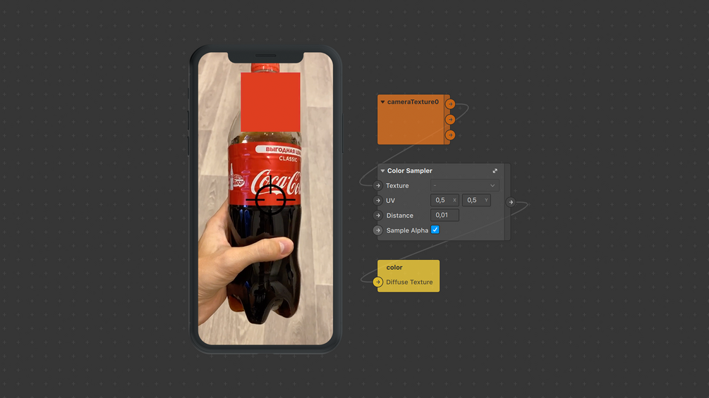 🇷🇺 Патч считывает цвет с камеры или любой другой текстуры. В полученный цвет можно покрасить любой объект сцены, или использовать как-то иначе.